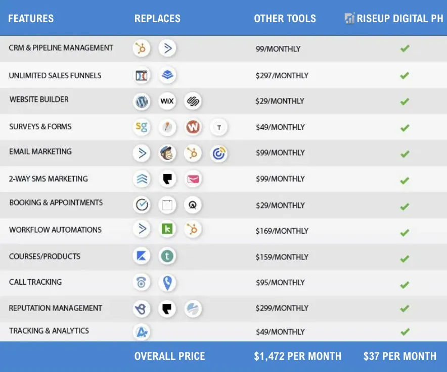 "RiseUp Digital PH helped me ditch 4 expensive apps ClickFunnels, Calendly, Mailchimp, and Hootsuite. Now I manage everything in one dashboard and pay just $32/month. Total game changer for solopreneurs like me!"